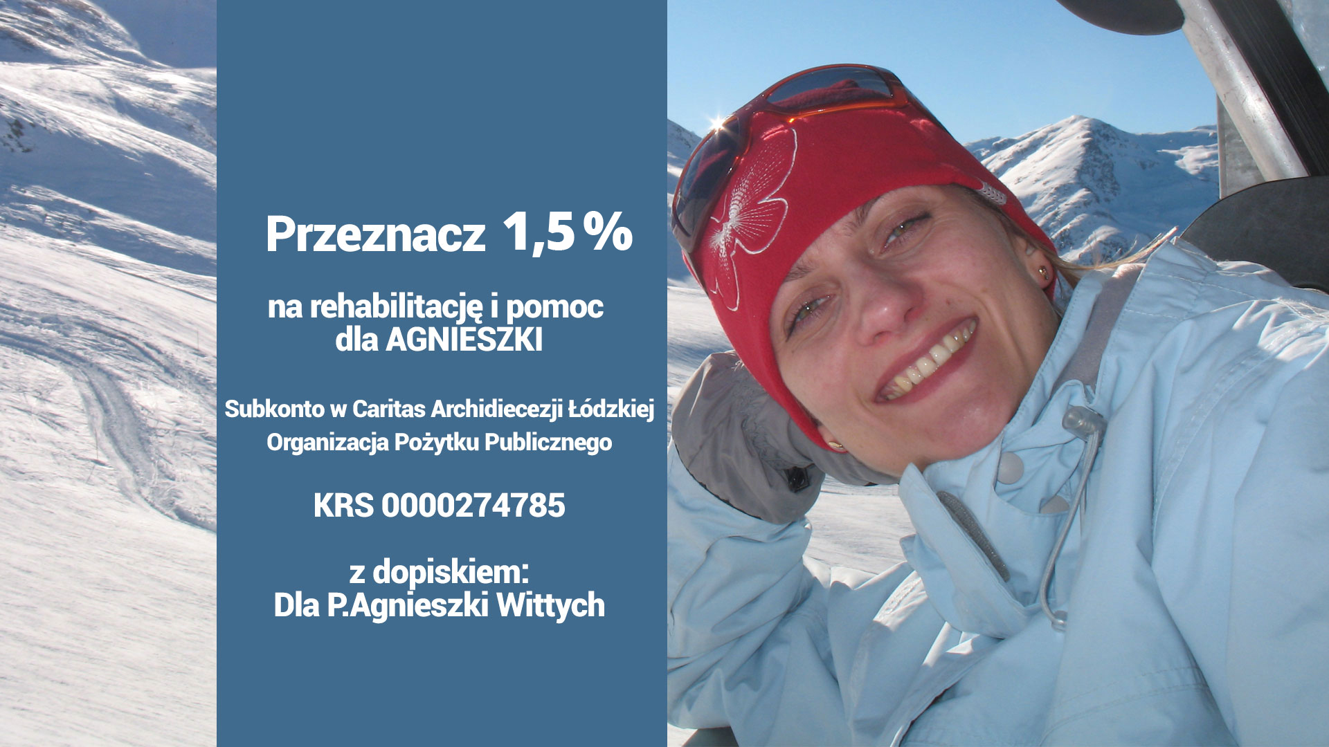 Kilka lat temu, 30.01.2009r., kiedy kładła się spać, była zdrową, piękną, tryskającą energią dziewczyną, ale w nocy wydarzyło się coś niewyobrażalnego. Coś, czego do dziś nie potrafią wyjaśnić lekarze. Agnieszka nad ranem usłyszała dźwięk budzika. Odruchowo go wyłączyła i... to była ostatnia czynność, jaką wykonała samodzielnie. To co się stało, nadal pozostaje tajemnicą. Jej serce nagle zatrzymało się. Śpiączka. Potem długa reanimacja i ratowanie życia.